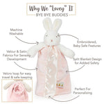 11 inch version of our Buddy Blanket Baby Safe Embroidered details Velcro loop for attaching to stroller and carseat easy to snuggle, with satin lining 100% polyester machine wash, dry low heat A smaller version of our best-loved Buddy Blanket, this lovey is ready to be on the go. With a handy loop on the back to attach to the car seat, stroller, or crib you're sure to never be left without this precious friend again. This favorite security blanket is a plush floppy-eared bunny with a handcrafted, baby-safe embroidered face and a snuggly soft pink velour split blanket, lined and edged in silky satin. Signature three carrot tag for little ones' fingers.