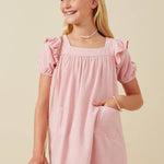 Our Patch Pocket Square Neck Ruffled Dress Features: * Woven Fabric * Square Cut Neckline * Ruffle Detail Measurements: Size Length Small 29" Medium 30" Large 31.5" X-Large 33.5" The measurements in the chart above reflect the garment laying flat. For body measurements please visit our Size Guide. Model Stats: * Height: 4'7" * Bust: 25.75" * Waist: 21.5" * Hip: 28.5" * Wearing Size: S Material & Care: * 70% Viscose 30% Linen * Hand Wash Cold * Hang Dry