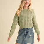 This lightweight long-sleeve sweater features a wavy pointelle knit for a delicate, textured look. The scallop edges add a soft, feminine touch to the crew neck design. Perfect for layering or wearing on its own for a stylish, breathable option!