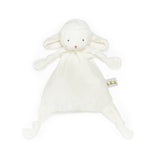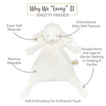 10" lovie with knotted arms and legs perfect for gentle chewing and self soothing untie knot to attach pacifier/get knots wet and freeze for sore gums machine wash and air dry Back by popular demand! Our Knotty Friend loveys have won the hearts of wee one's around the world. A sweet, fuzzy-faced lamb with baby-safe embroidered face, velour floppy body in soft warm white, this knotty friend will not want to be out of your little one's hands. The knotted arms and legs are perfect for gentle chewing. Signature three carrot tag for little one's fingers.