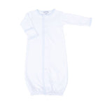 Discover versatile comfort with the Magnolia Baby New Beginnings Converter in Blue. This innovative garment, crafted from luxurious Pima Cotton, transforms from a cozy gown into a footed romper with easy snap closures, featuring delicate blue minicheck trim along the placket, neckline, and cuffs. Perfect for newborns, it adapts to your baby's needs throughout the day and night.