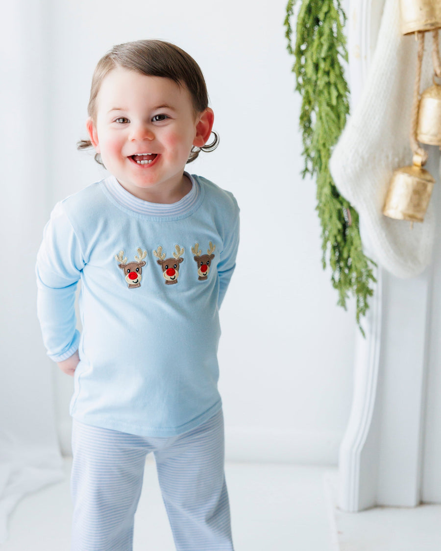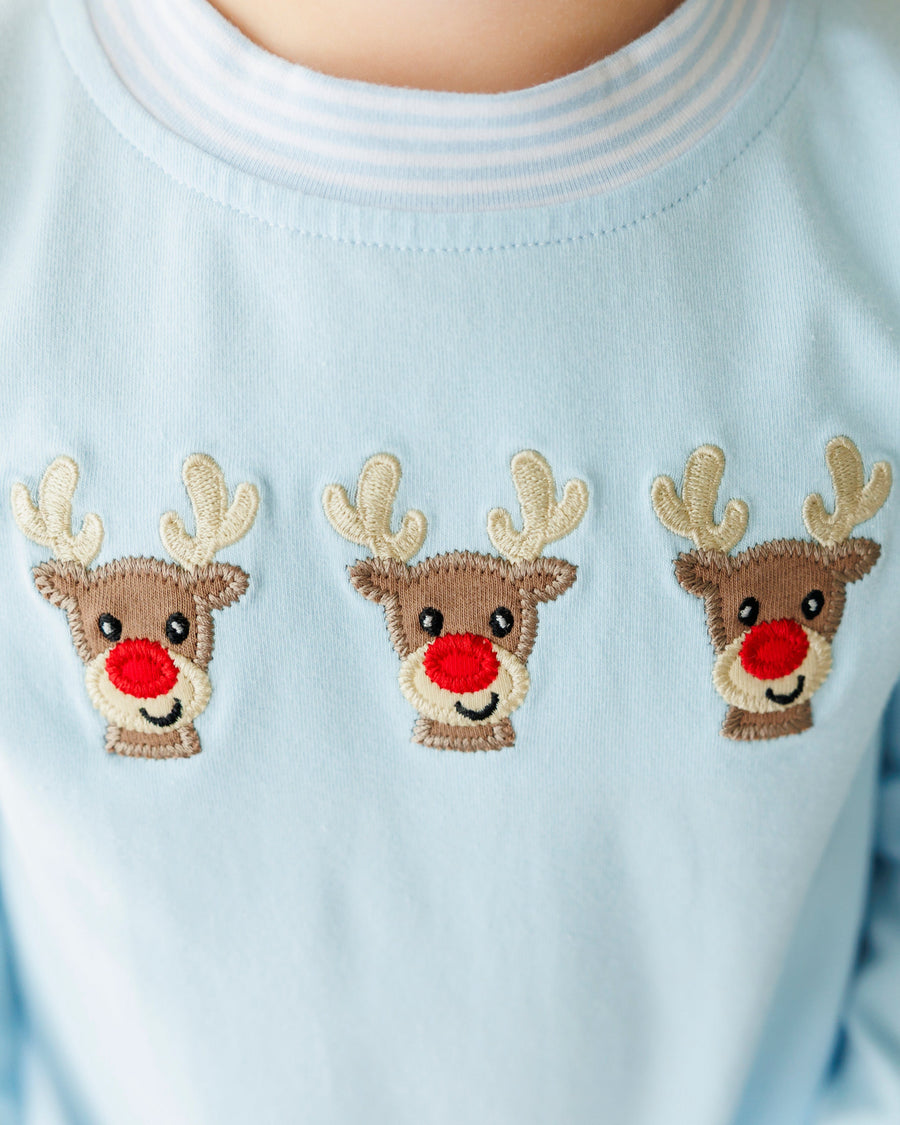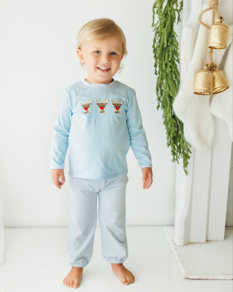 Get your little one ready for holiday fun with the Run Run Rudolph Bloomer Pants Set. This playful outfit features a long-sleeve solid light blue shirt accented with light blue stripes on the collar and cuffs, perfectly matched with striped bloomer pants. A charming trio of Rudolph’s faces appliquéd on the shirt adds festive cheer, making it an adorable choice for Christmas celebrations. Comfortable and cute, this set is perfect for your boys to run, play, and spread holiday joy.