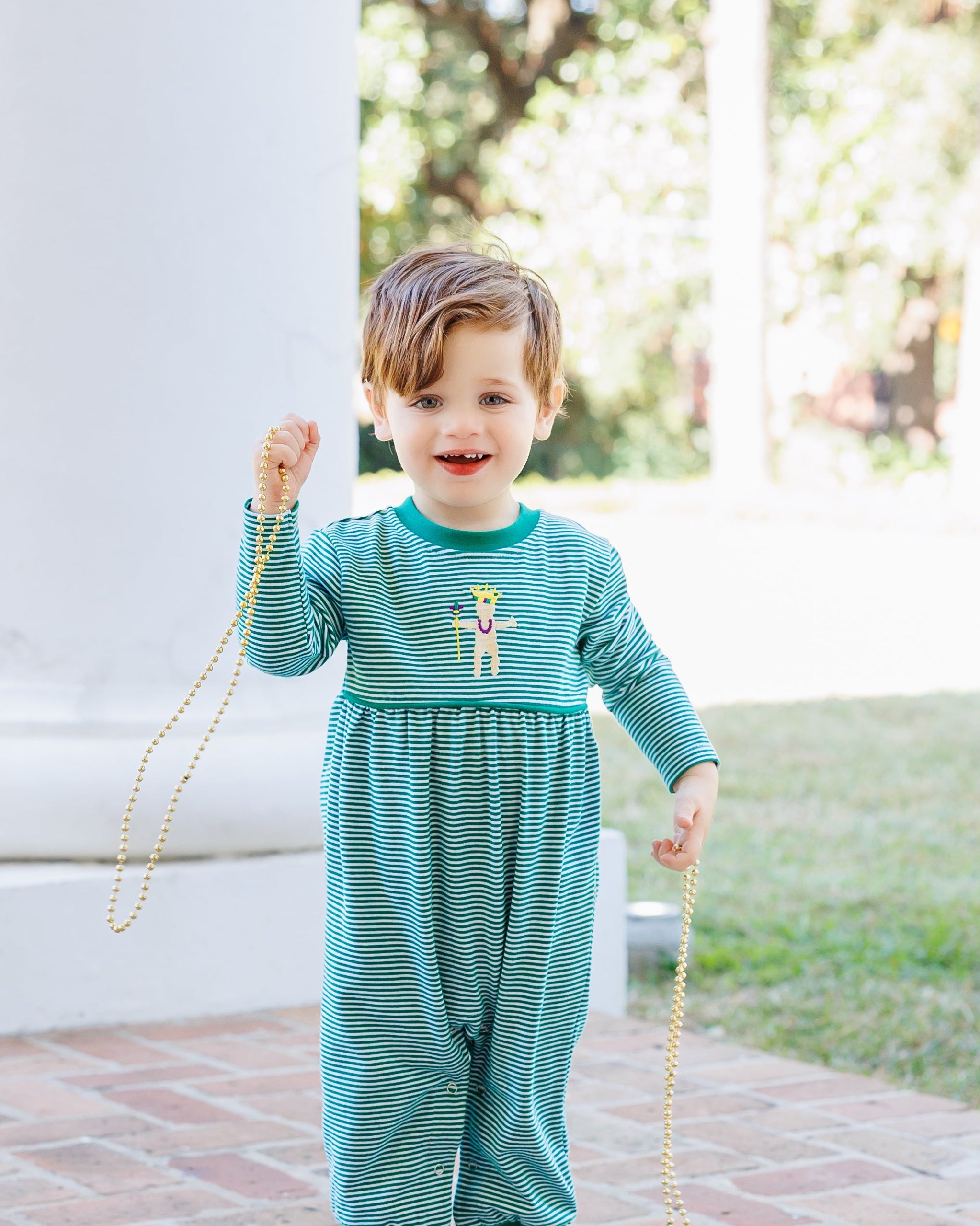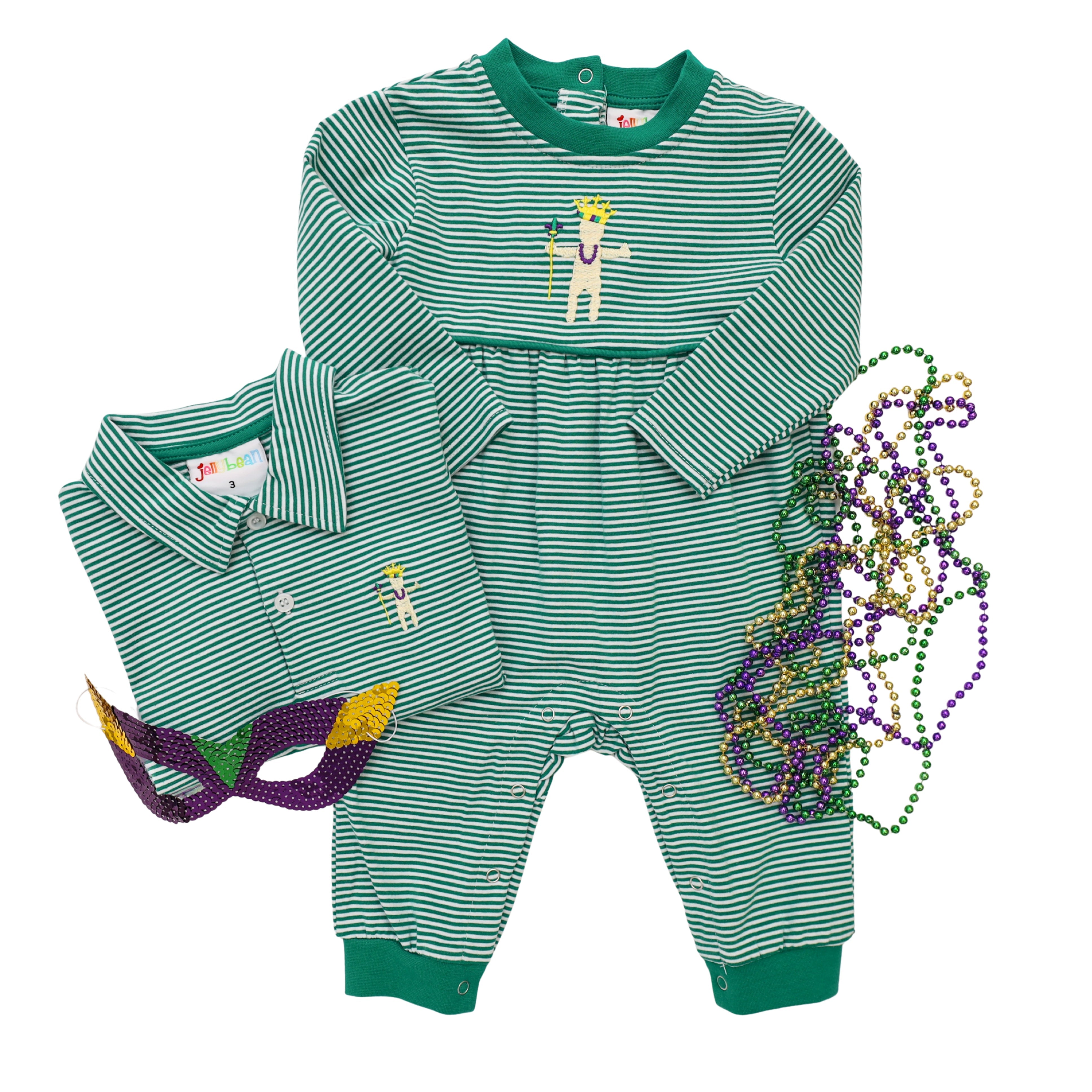 Watch your baby boy shine in this festive King Cake Baby Romper, the perfect outfit for celebrating Mardi Gras season!