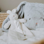 11 inch version of our Buddy Blanket Baby Safe Embroidered details Velcro loop for attaching to stroller and carseat easy to snuggle, with satin lining 100% polyester machine wash, dry low heat A smaller version of our best-loved Buddy Blanket, this Lovey is ready to be on the go. With a handy loop on the back to attach to the car seat, stroller or crib you're sure to never be left without this precious friend again. This favorite security blanket is a plush floppy eared bunny with handcrafted, baby-safe embroidered face and a snuggly soft white velour split blanket, lined and edged in silky satin. Signature three carrot tag for little one's fingers.