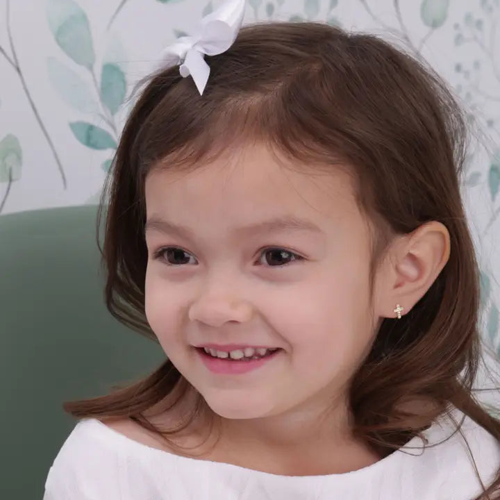 Children's 14K gold-plated (over sterling silver) cross earrings with sparkling cubic zirconia stones for little girls. These earrings have screw backs keeping the earrings secure so she won't lose them. Earrings are made with precious metals and should not irritate sensitive ears and come in a darling black velvet heart gift box!