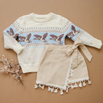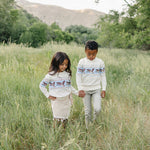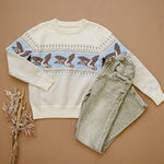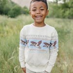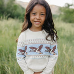 A timeless heirloom piece with a touch of the great outdoors. This cozy knit sweater features a classic cream base with a soft blue fair isle pattern showcasing flying mallards. Perfect for cool days, family photoshoots, or holiday gatherings, it's made for comfort and style that lasts season after season.