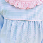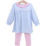 Bounce into fall fun with our Audrey Pant Set! This adorable combo features a light blue striped top with a playful pink ruffled collar that pairs perfectly with the matching pink leggings. Perfect for playground adventures or family photos, this set brings smiles and style to autumn days!