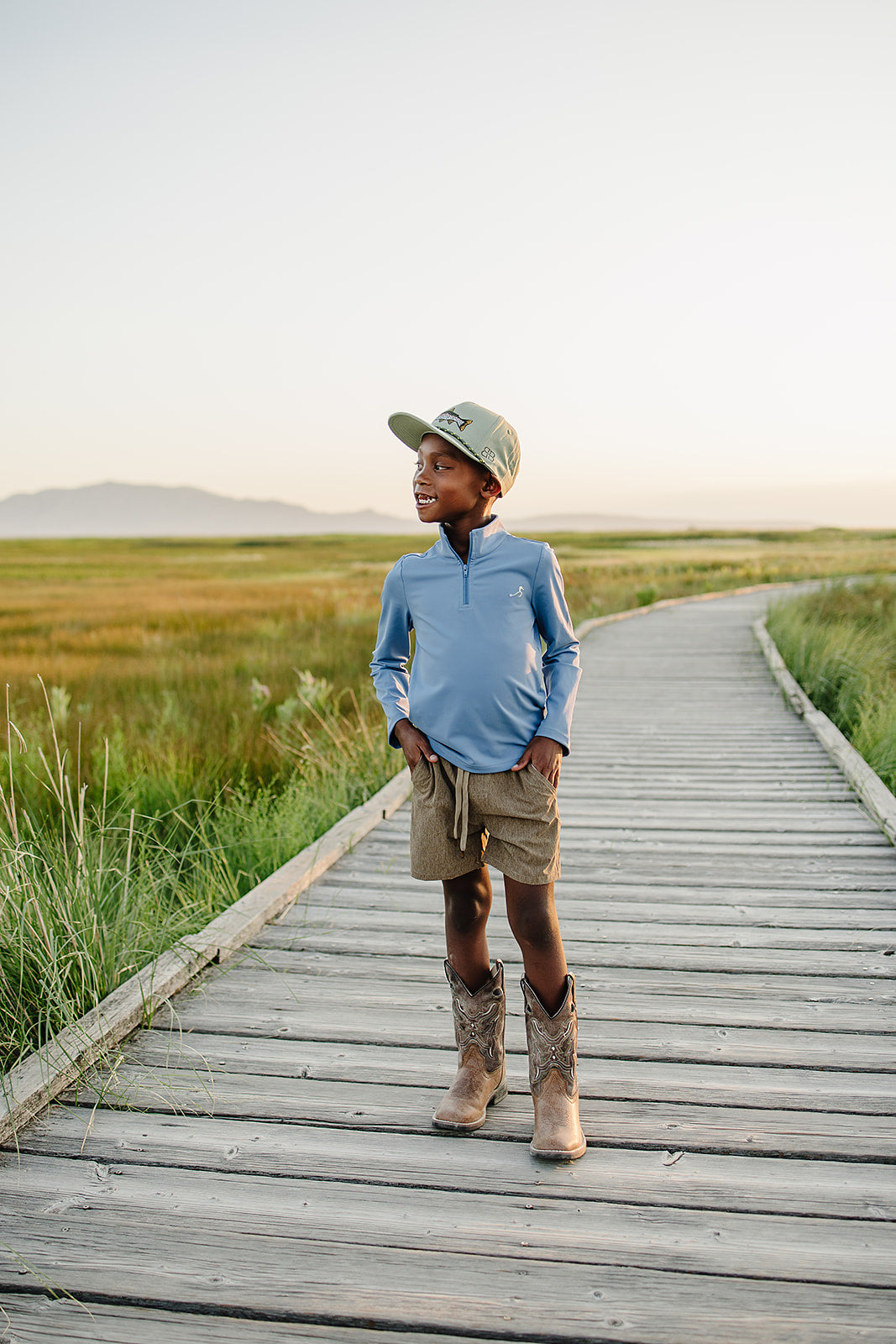 Built for cool mornings and sunny afternoons, the Beau Quarter Zip is a lightweight performance layer crafted with UPF 50+ protection and breathable comfort. Made in lake blue, this pullover is perfect for layering on outdoor adventures. It keeps your little guy protected, comfortable, and ready for whatever the day brings. Features 'wild horses' horse print at inner collar.