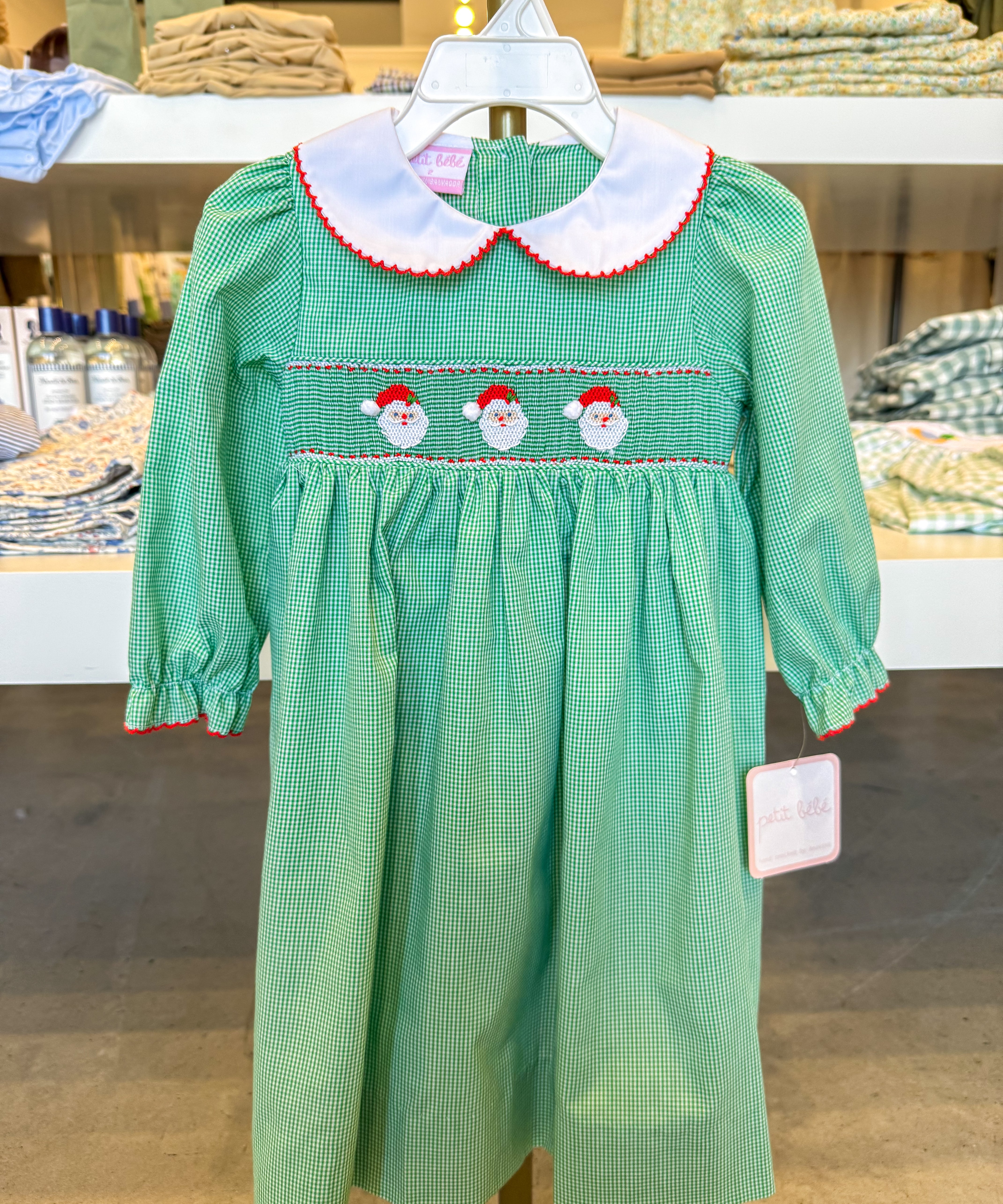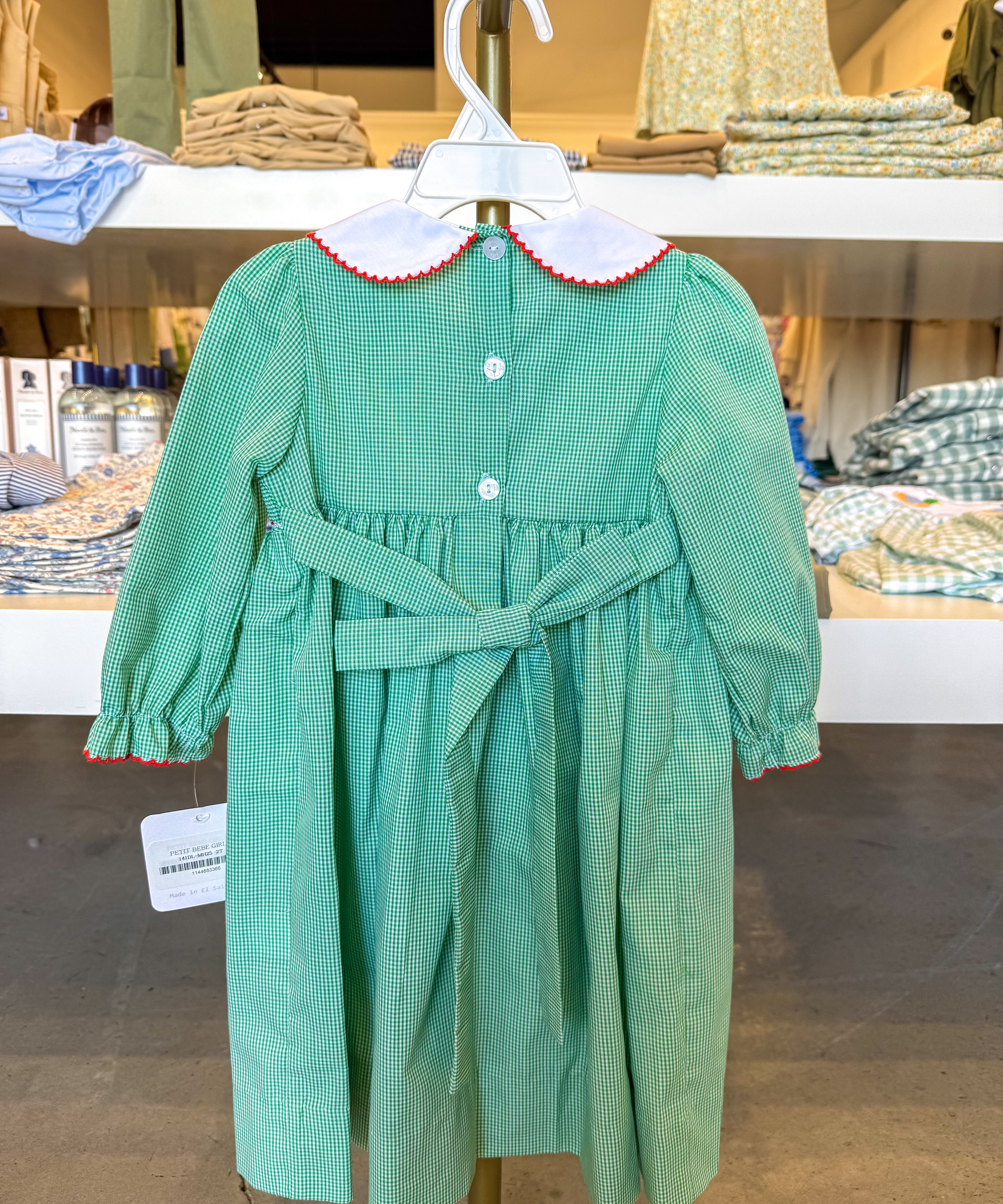 Santa Face Girls Green Gingham Dress