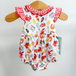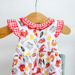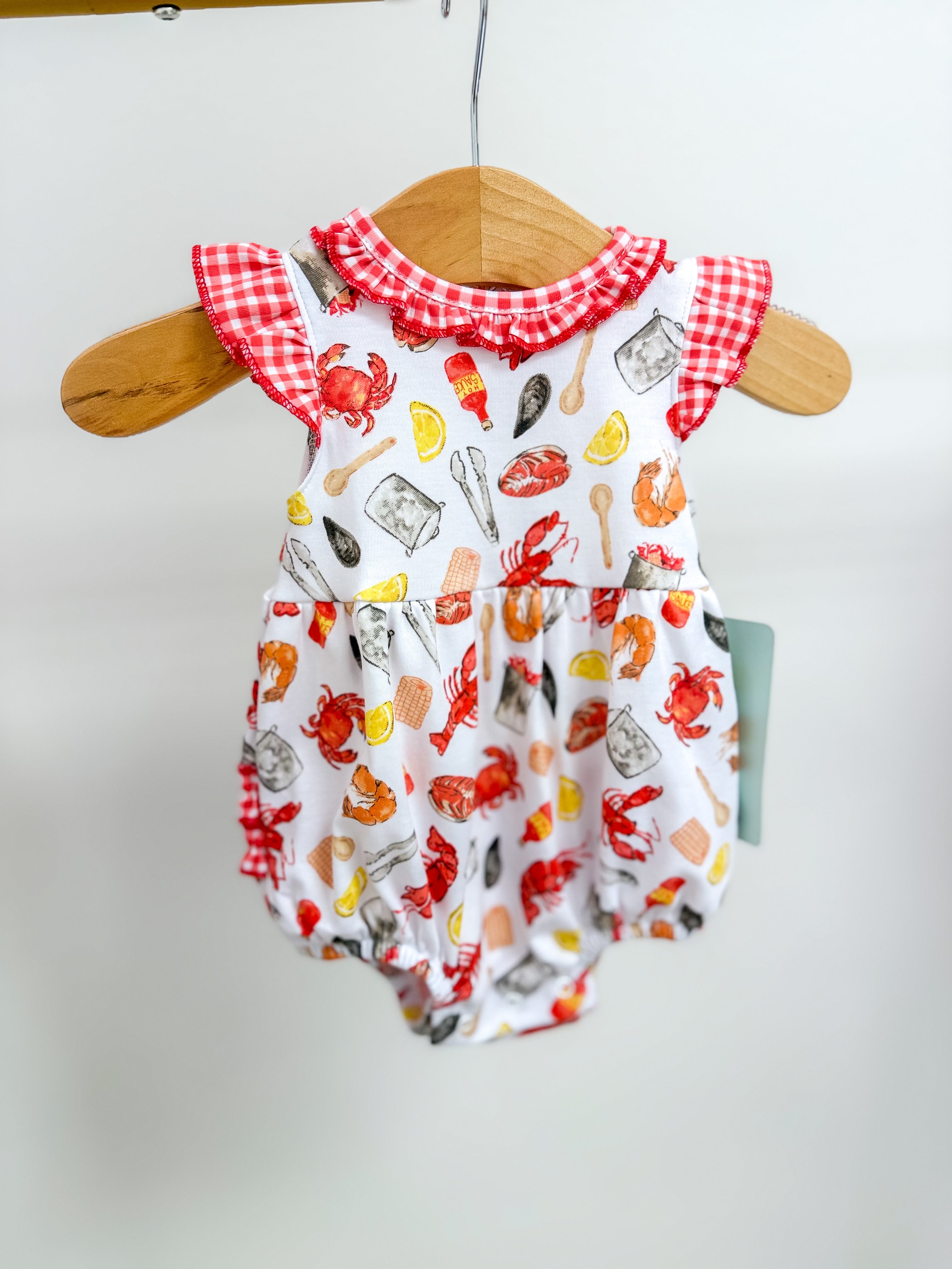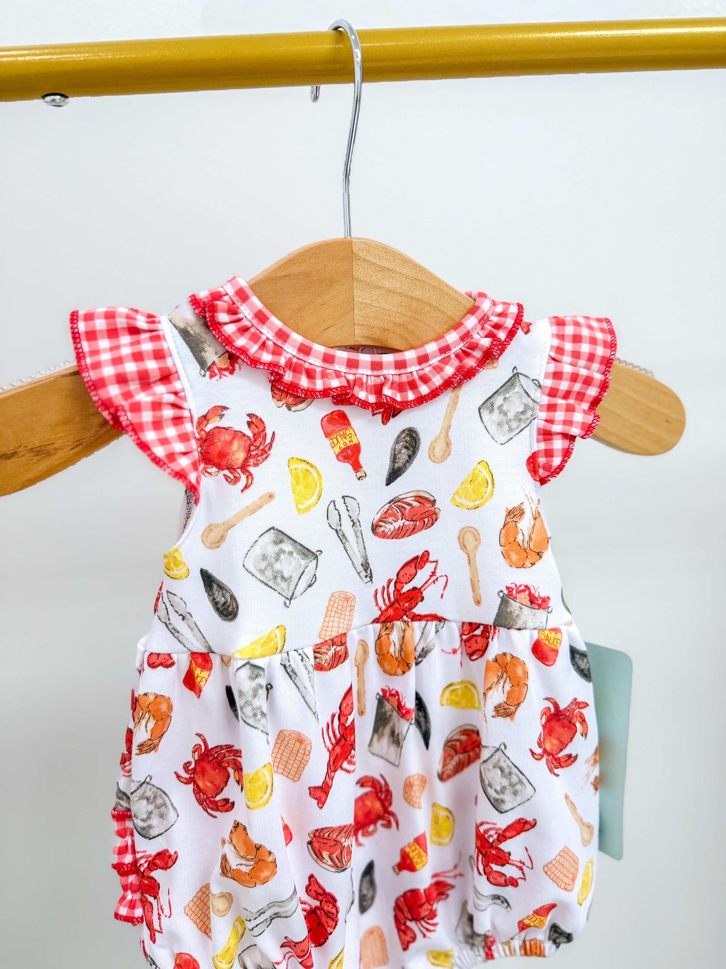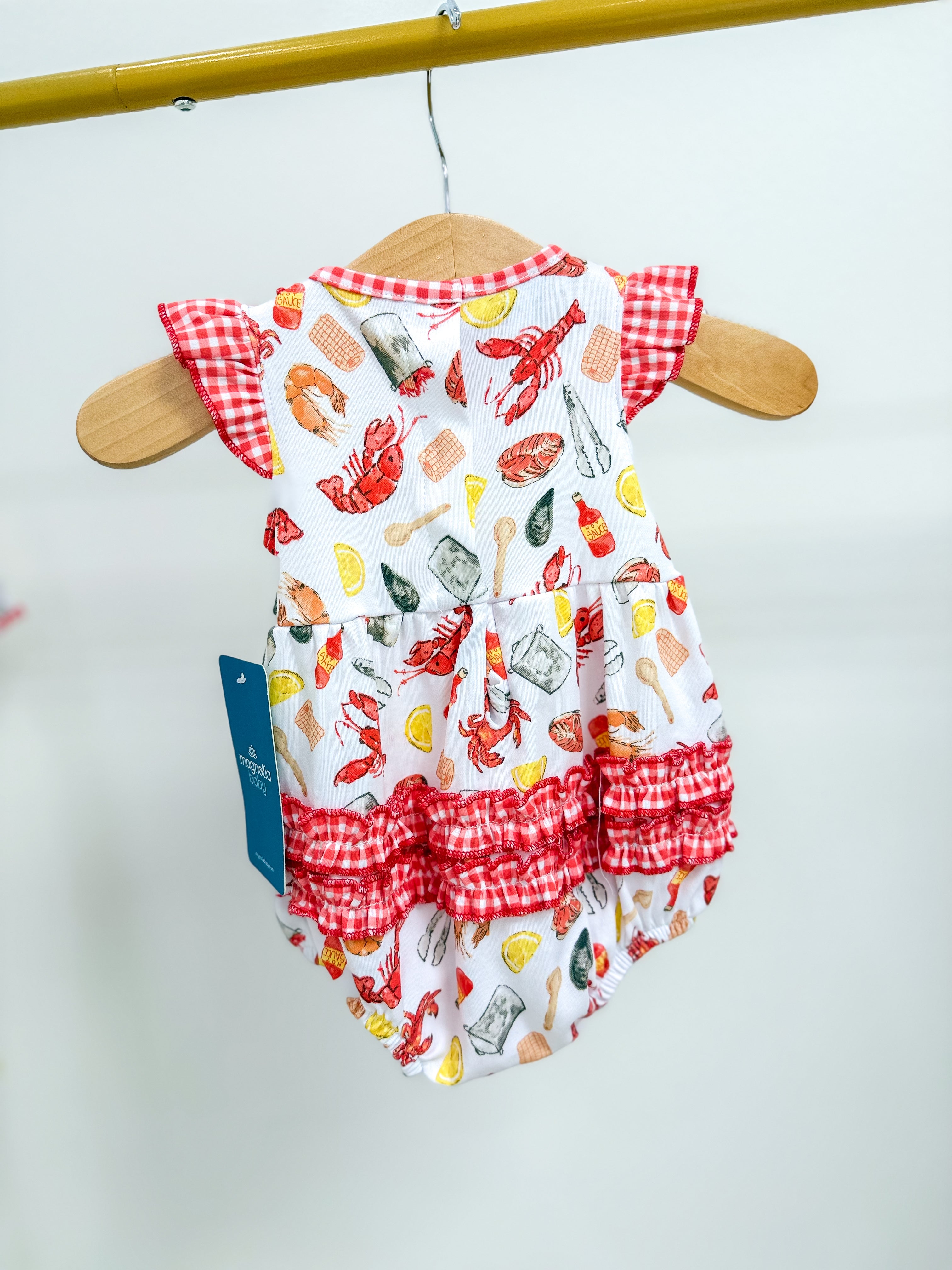 This adorable Pima Cotton bubble is perfect for spring festivities. Featuring a sweet Crawfish Print and feminine red plaid ruffles, it offers luxurious comfort and charming Southern style. Convenient snaps ensure easy dressing for your little one's active days.