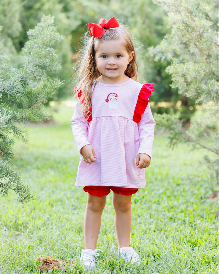 Celebrate the season in style with the Ho Ho Ho Bloomer Set! This adorable outfit features a long sleeve top with delicate light pink and white stripes, accented by bright red ruffles that perfectly match the festive red bloomers. A charming Santa face applique adds a whimsical holiday touch, making it the perfect playful look for your little one’s Christmas fun. Cozy, cute, and full of cheer!