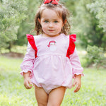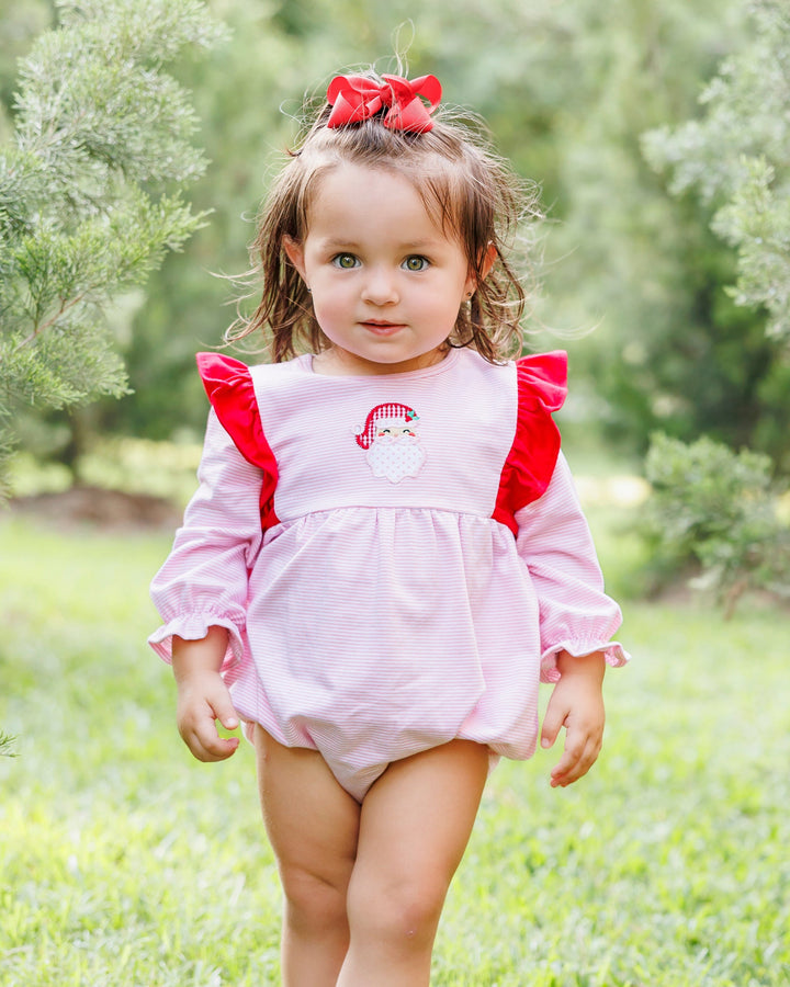 Celebrate the season in style with the Ho Ho Ho Evie Bubble! This adorable outfit features a long sleeve top with delicate light pink and white stripes, accented by bright red ruffles. A charming Santa face applique adds a whimsical holiday touch, making it the perfect playful look for your little one’s Christmas fun. Cozy, cute, and full of cheer!