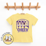 Cheer your heart out! Design features a butter-colored tee with purple and white accents and showcases cheerleaders in a stadium full of fans. This is a back design with a matching specialty left chest logo on the front. 100% Combed Ring-spun Cotton.