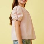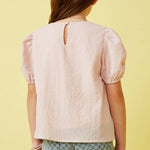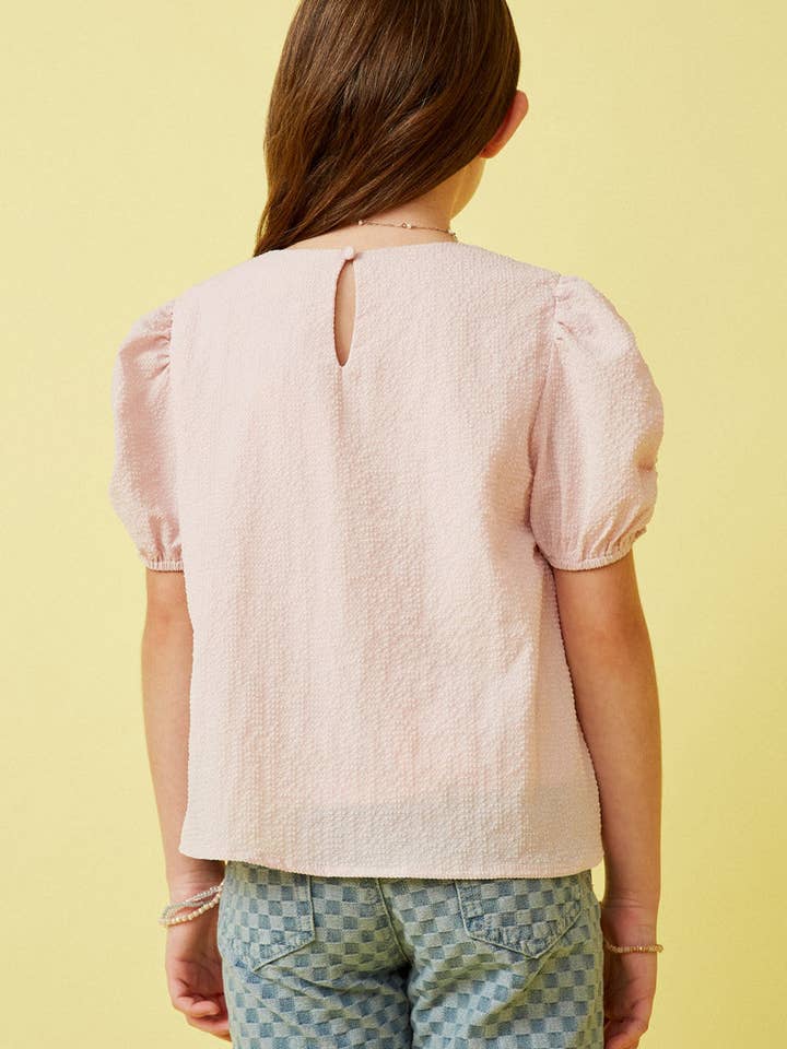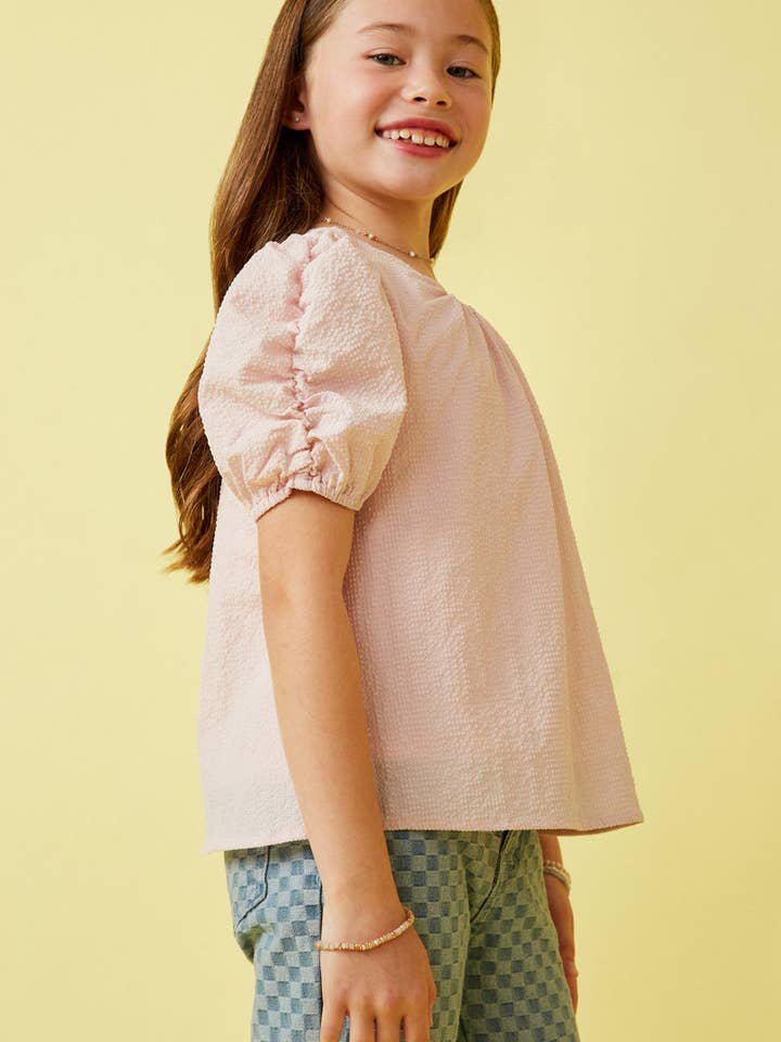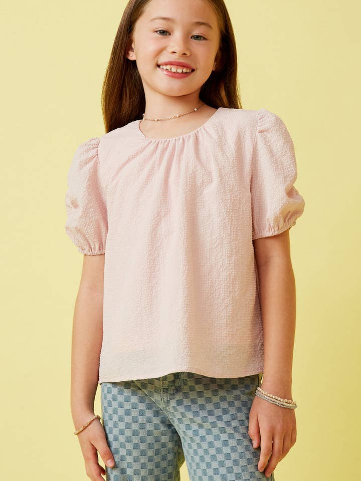 Girls Pink Seersucker Textured Puff Sleeve Top