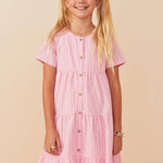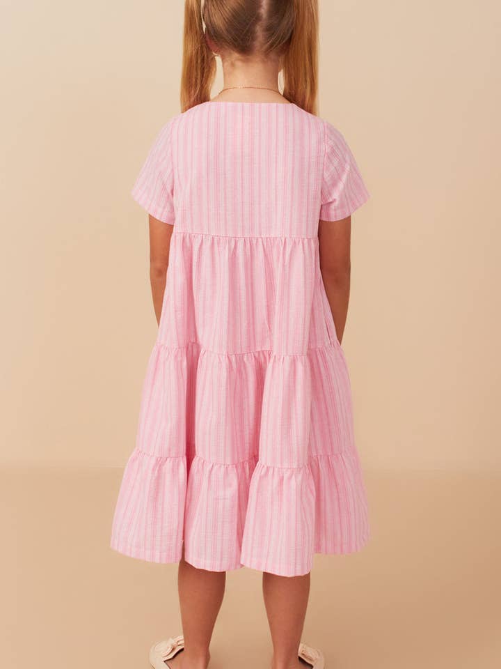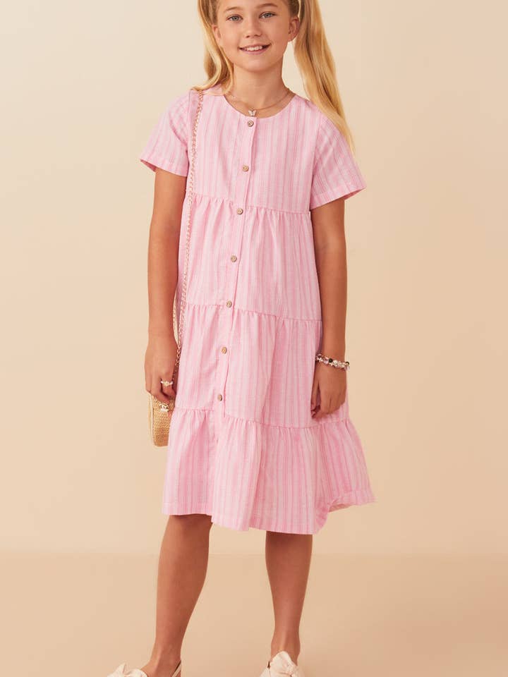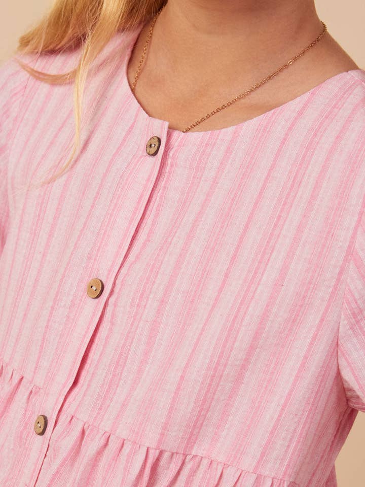 Features: * Stripe Textured Woven Fabric * Button Down * Tiered Skirt Measurements: Size Length Chest Small 33" 15" Medium 33.5" 16" Large 34.25" 17" X-Large 35.25" 18.5" The measurements in the chart above reflect the garment laying flat. For body measurements please visit our Size Guide. Model Stats: Material & Care: * 100% Cotton * Hand Wash Cold * Hang Dry