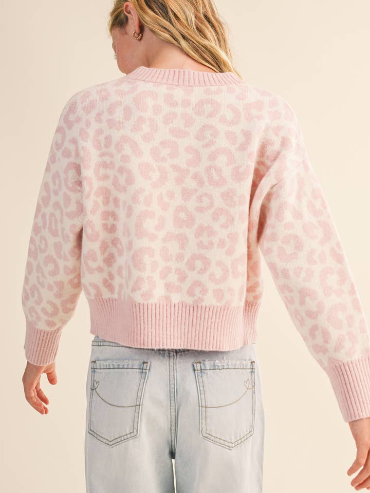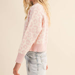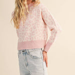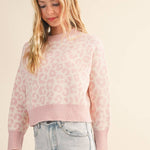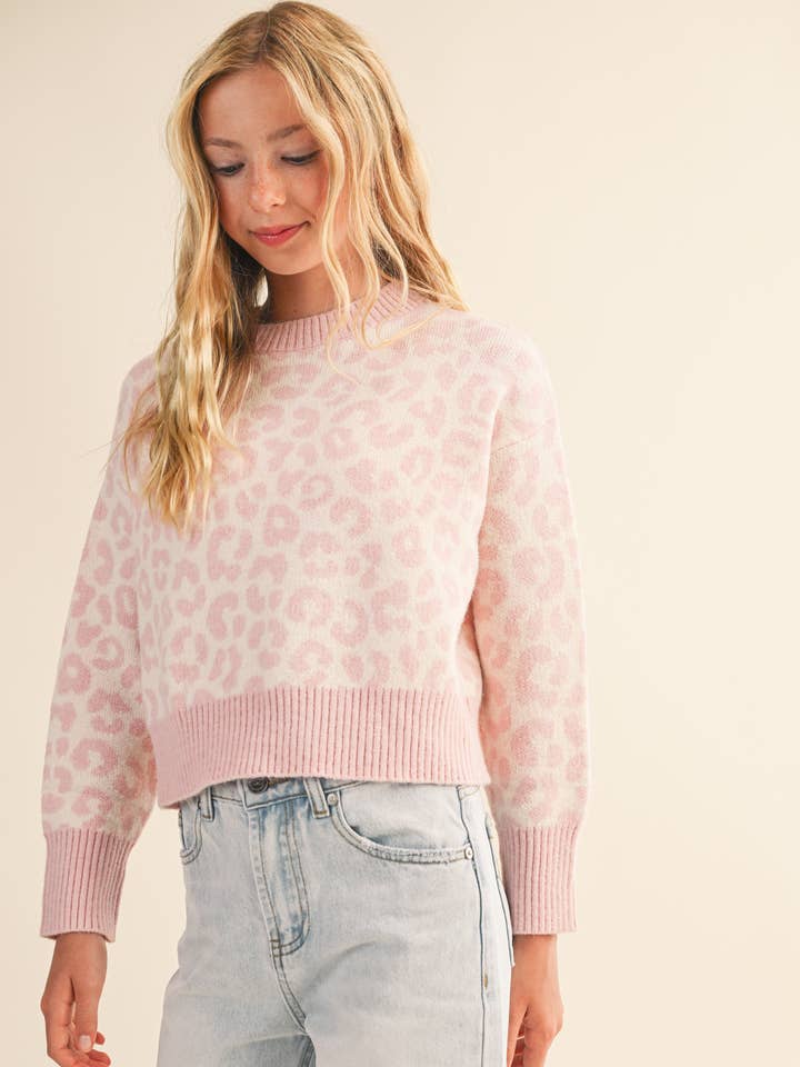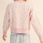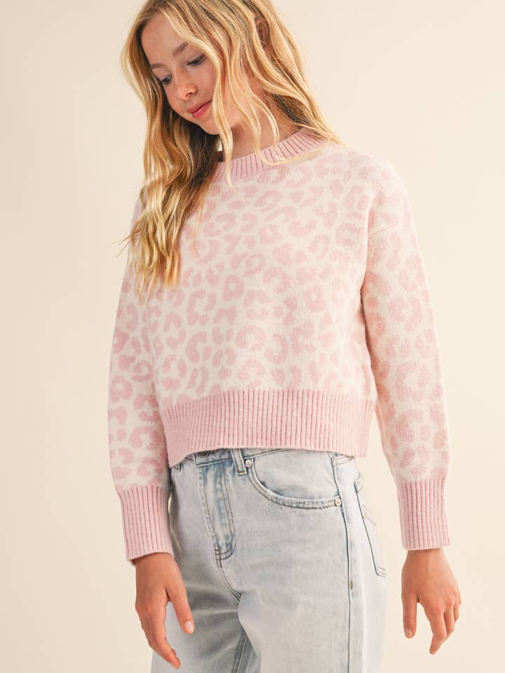 Make a bold yet playful statement with this cozy pink leopard print sweater. Featuring an all-over tonal animal print in soft blush and baby pink hues, this sweater blends trend-right style with everyday comfort. The relaxed fit and ribbed trims at the neck, cuffs, and hem offer a snug yet flexible wear, perfect for school, playdates, or weekend adventures. Soft to the touch and full of personality, it's a must-have piece for the wild-at-heart fashionista.