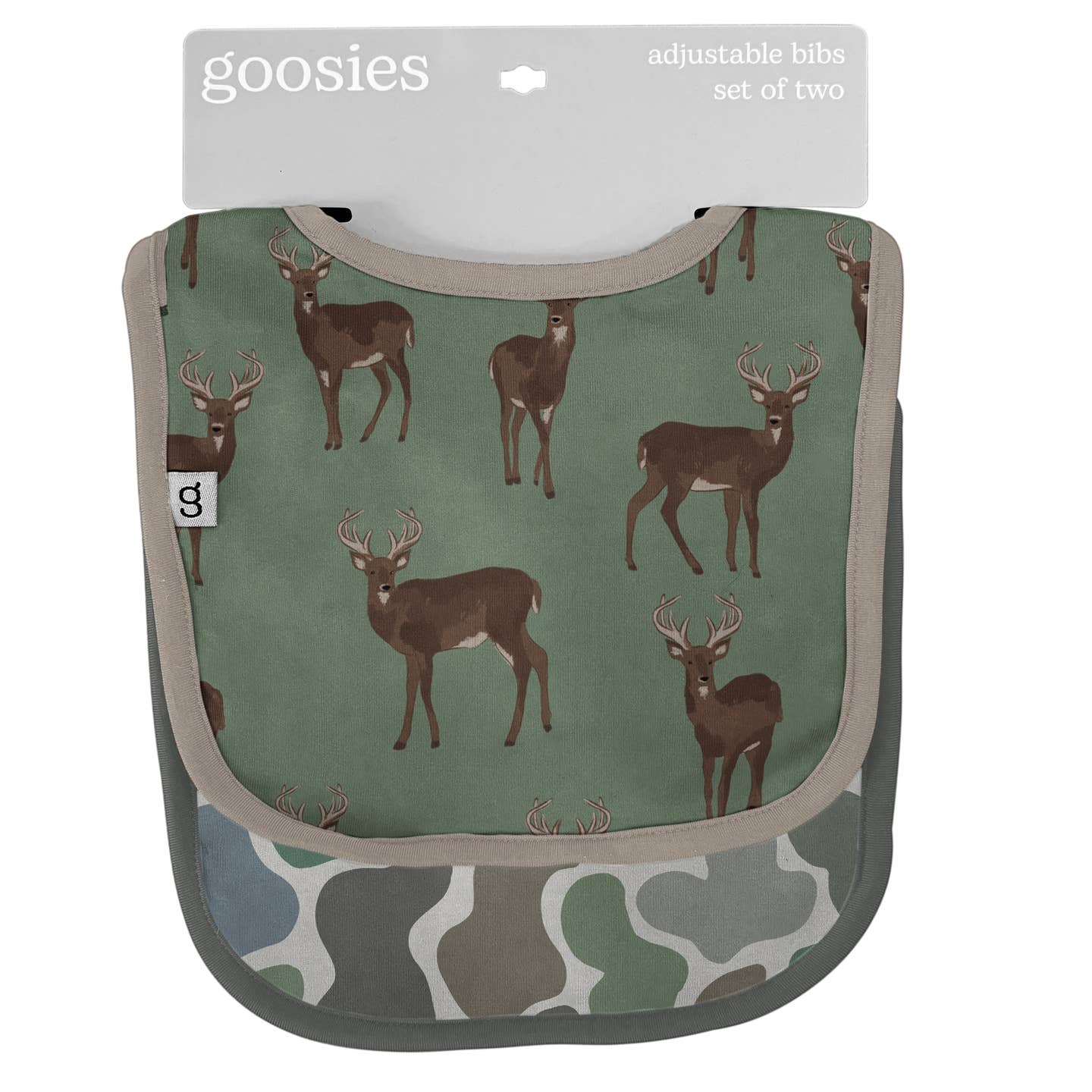 Deer / Camo Set of Two Adjustable Bibs Front: 95% Bamboo, 5% Spandex Back: Back: 65% Polyester, 35% Cotton Terrycloth Machine wash cold on gentle cycle. Flat dry or tumble low. Packaged on a hangable branded card.