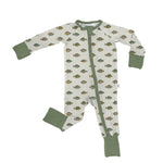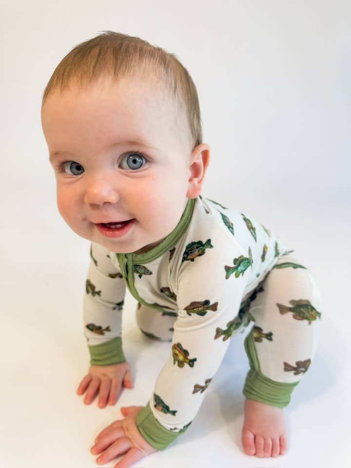 Lake Fish Print with Sage Green Trim Our Zip Pajamas feature a two way zipper, convertible feet Extra length for longer wear!