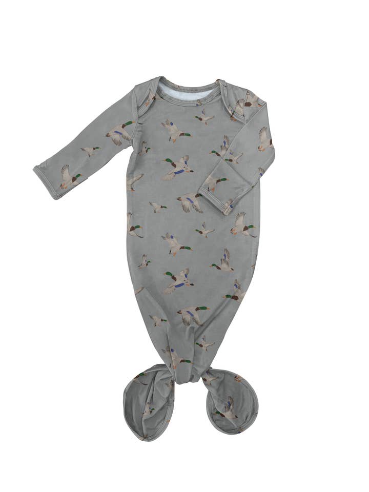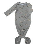 Knotted infant gown with foldable scratch mitts available in newborn and 0-3 months.