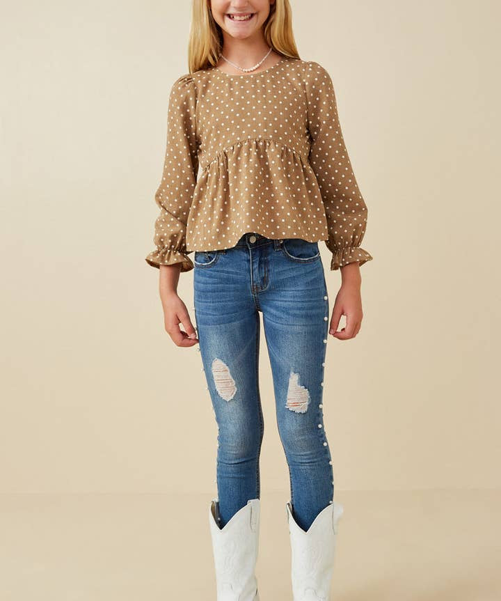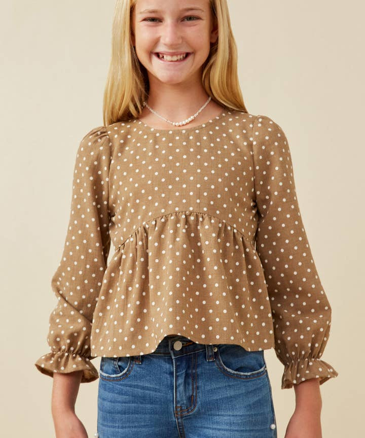 Mocha Polka Dot Cinched Cuff Peplum Top