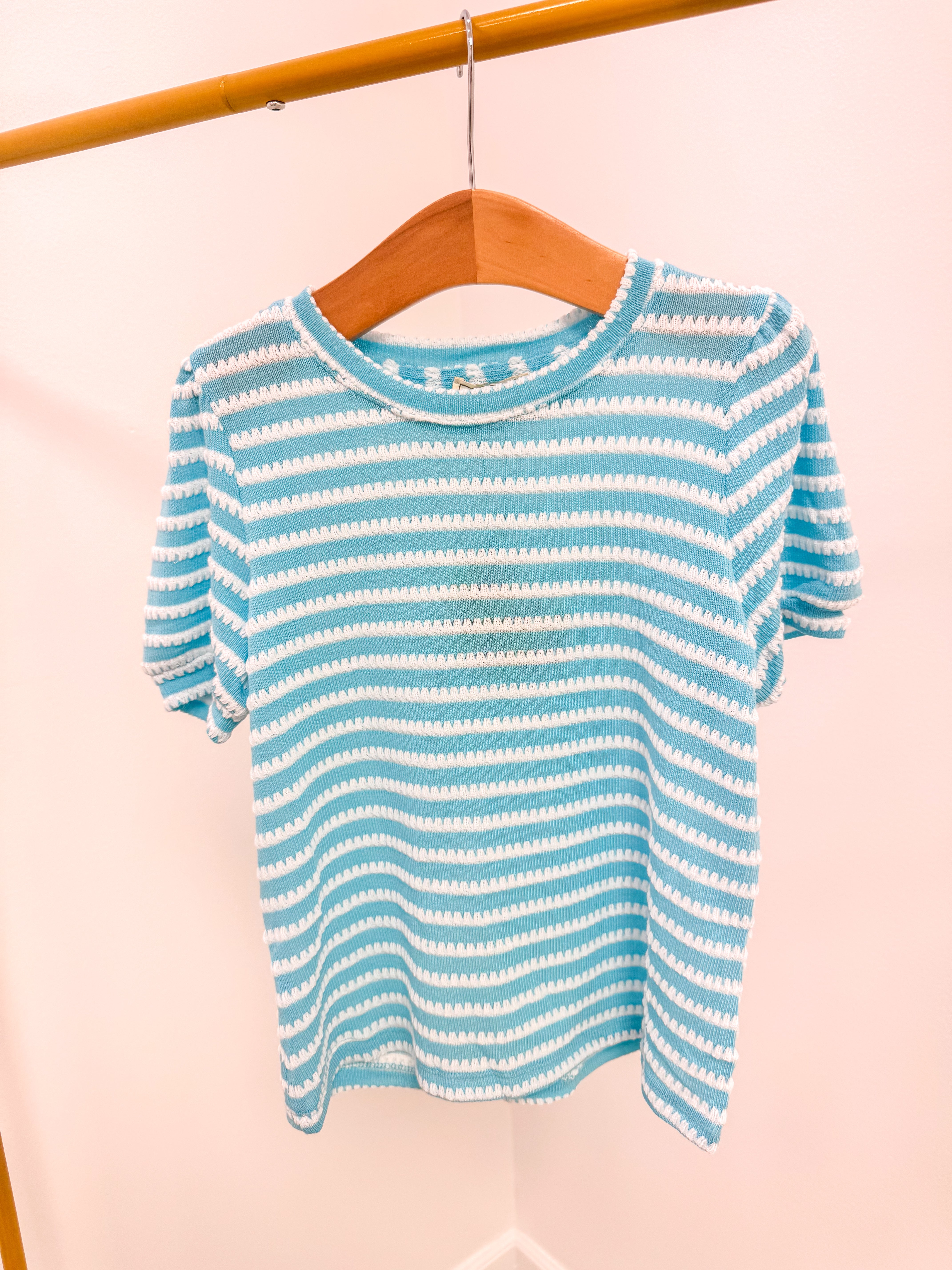 Blue Textured Stripe Puff Sleeve Knit Top