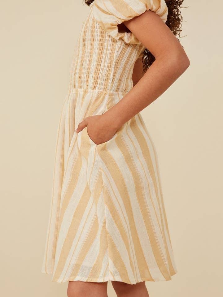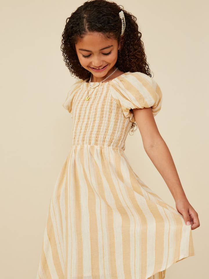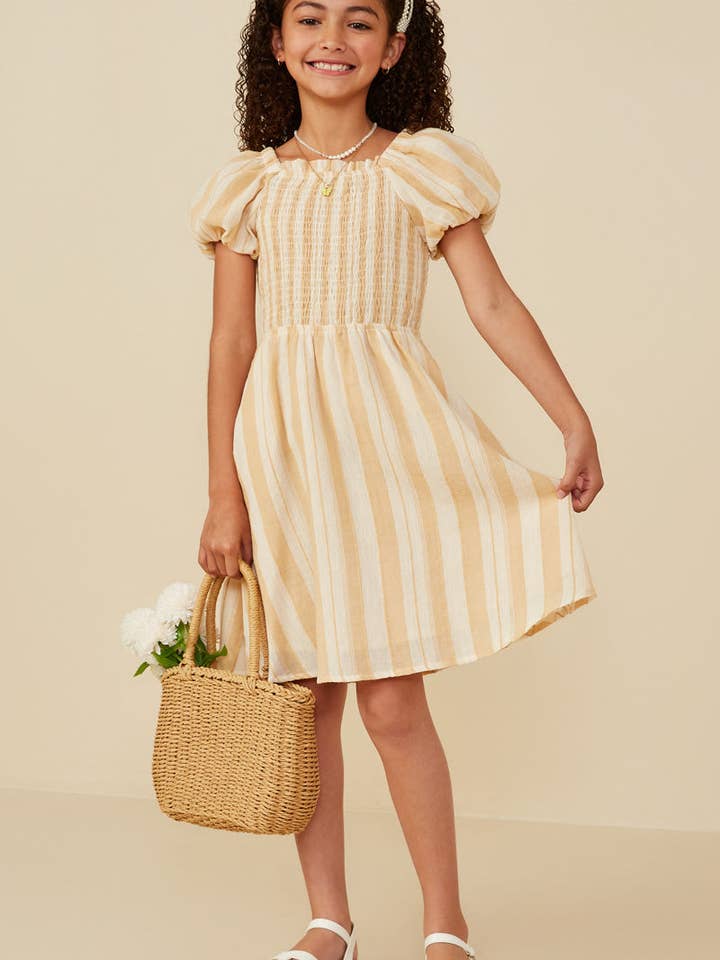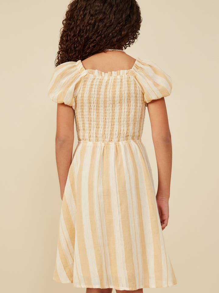 Our Textured Stripe Smocked Puff Sleeve Dress Features: * Textured Stripe Fabric * Smocked Detail * Puff Sleeve Measurements: Size Length Chest Waist Small 29" 12" 10.5" Medium 30.5" 13" 11.25" Large 32" 14" 12" X-Large 33.5" 15" 12.75" The measurements in the chart above reflect the garment laying flat. For body measurements please visit our Size Guide. Model Stats: * Height: 4'4" * Wearing Size: S Material & Care: * 65% Cotton 35% Linen * Hand Wash Cold * Hang Dry