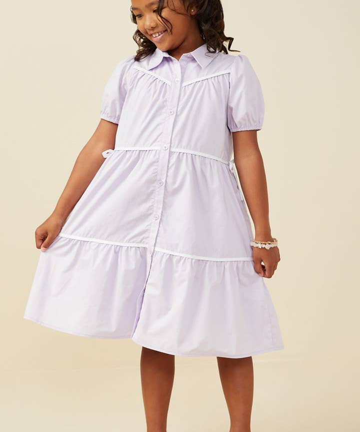 Girls Lavender Contrast Piping Ribbon Button Dress
