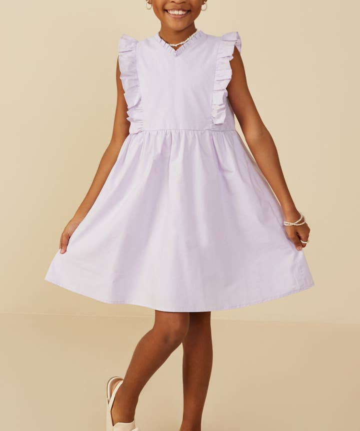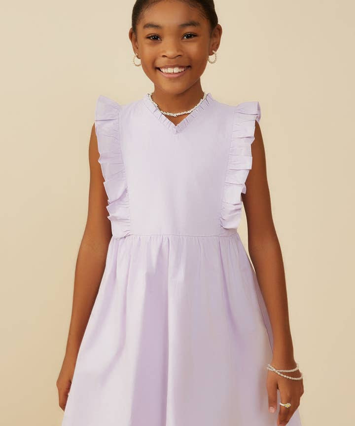 Girls Lavender Ruffle V-Neck Sleeveless Poplin Dress