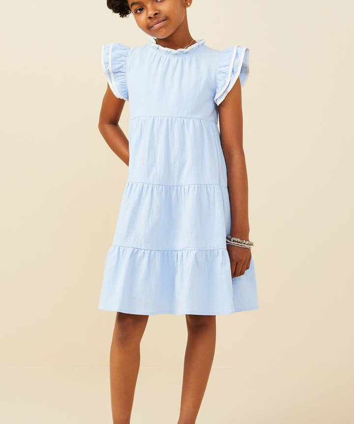Girls Blue Contrast Piped Ruffle Dress