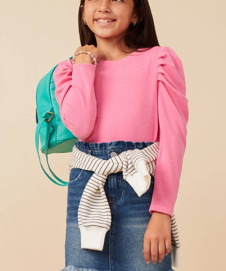 Girls Pink Pleated Puff Shoulder LS Knit Top