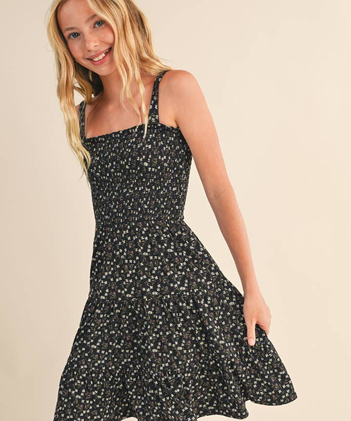 Black Floral Tween Girls Smocked Knit Tiered Mini Dress