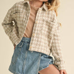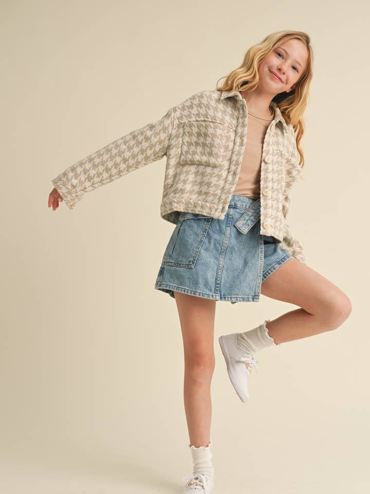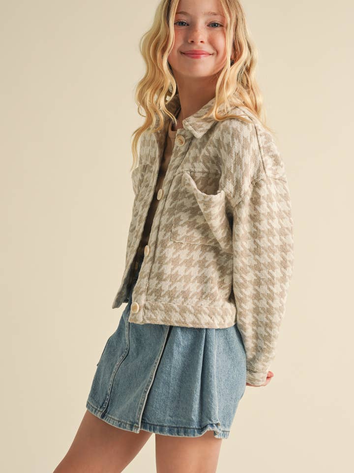 TWEEN KIDS GIRLS CROPPED TRUCKET JACKET IN HOUNDSTOOTH This stylish and comfortable girls houndstooth jacket is suitable for many occasions, such as camp, travel, school, bike ridding, street, photos, birthday, hiking, family day etc, this is truly a great wardrobe staple our stylish girls.