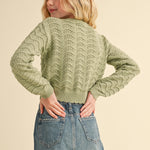 This lightweight long-sleeve sweater features a wavy pointelle knit for a delicate, textured look. The scallop edges add a soft, feminine touch to the crew neck design. Perfect for layering or wearing on its own for a stylish, breathable option!