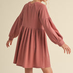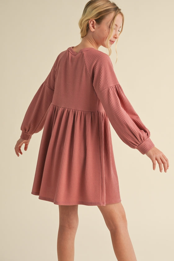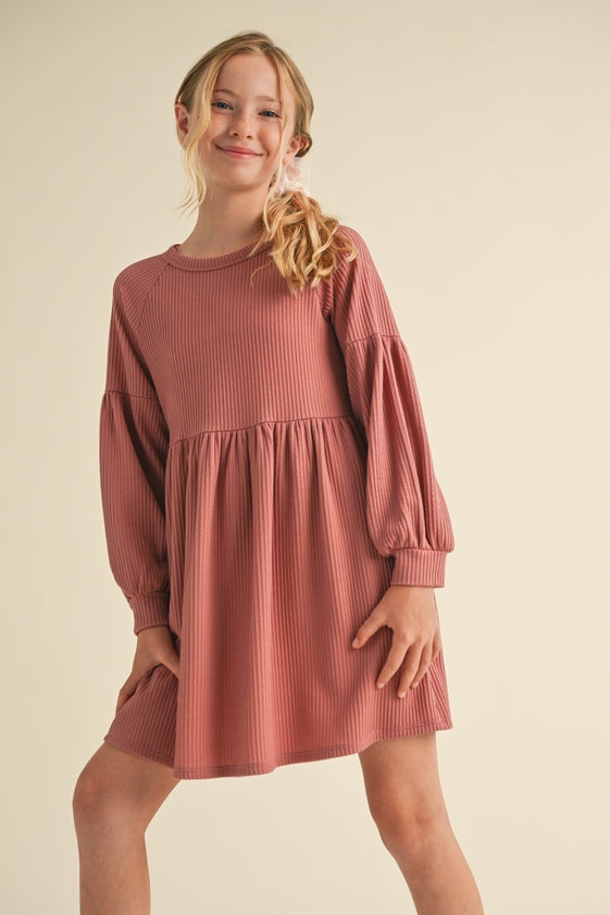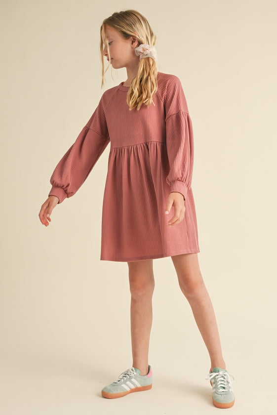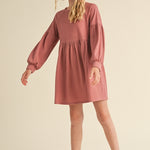 LONG SLEEVE KNIT DRESS- DOUBLE KNIT. The dress features drop shoulder balloon sleeves that are puffed up and taper down to a fitted cuff.