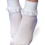 This eyelet lace sock is every girls go to sock accessory. A great sock to wear everyday and can be dressed up or worn with casual play clothes to make any outfit perfect. The perfect sock to pair with Mary Janes! Made with high quality cotton yarn to keep feet comfortable. Knit with just the right amount of spandex to keep socks on and in place. Sizes range from newborn baby, infant, toddler to big girl.