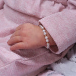 This keepsake bracelet is made with genuine soft white high-end Austrian simulated pearls accented with 14K Gold-plated beads! This is a high quality bracelet in sterling silver with 14K gold plating. Each bracelet has an extension chain, so as the child grows you just move to the next link for a perfect fit. This bracelet is available in three sizes and is great for infants, babies, toddlers, and kids and comes in a beautiful gift box. Hand made in the USA!