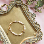 This keepsake bracelet is hand-made in the USA with high-end Austrian simulated pearls and 14K Gold-plated beads accented with a dainty cross embellished in the center! This is a high quality bracelet made with sterling silver and plated in 14K gold with high-end crystals. This makes a very special baptism gift, infant dedication gift, or First Communion Keepsake for girls. Each bracelet has an extension chain, as the child grows just move to the next link for a perfect fit. This jewelry is available in three sizes and is great for infants, babies, toddlers, and older girls. This cross bracelet comes in a beautiful gift box and is hand-made in the USA. A keepsake she will cherish Forever!