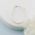 Beautiful keepsake sterling silver bracelet with strand of genuine soft white freshwater pearls - a gorgeous classic. Your child's first pearls! Each bracelet has an extension chain, as the child grows you just move to the next link for a perfect fit. This bracelet is available in three sizes and is great for infants, babies, toddlers, and kids. This jewelry comes in a beautiful gift box. Hand made in the USA!