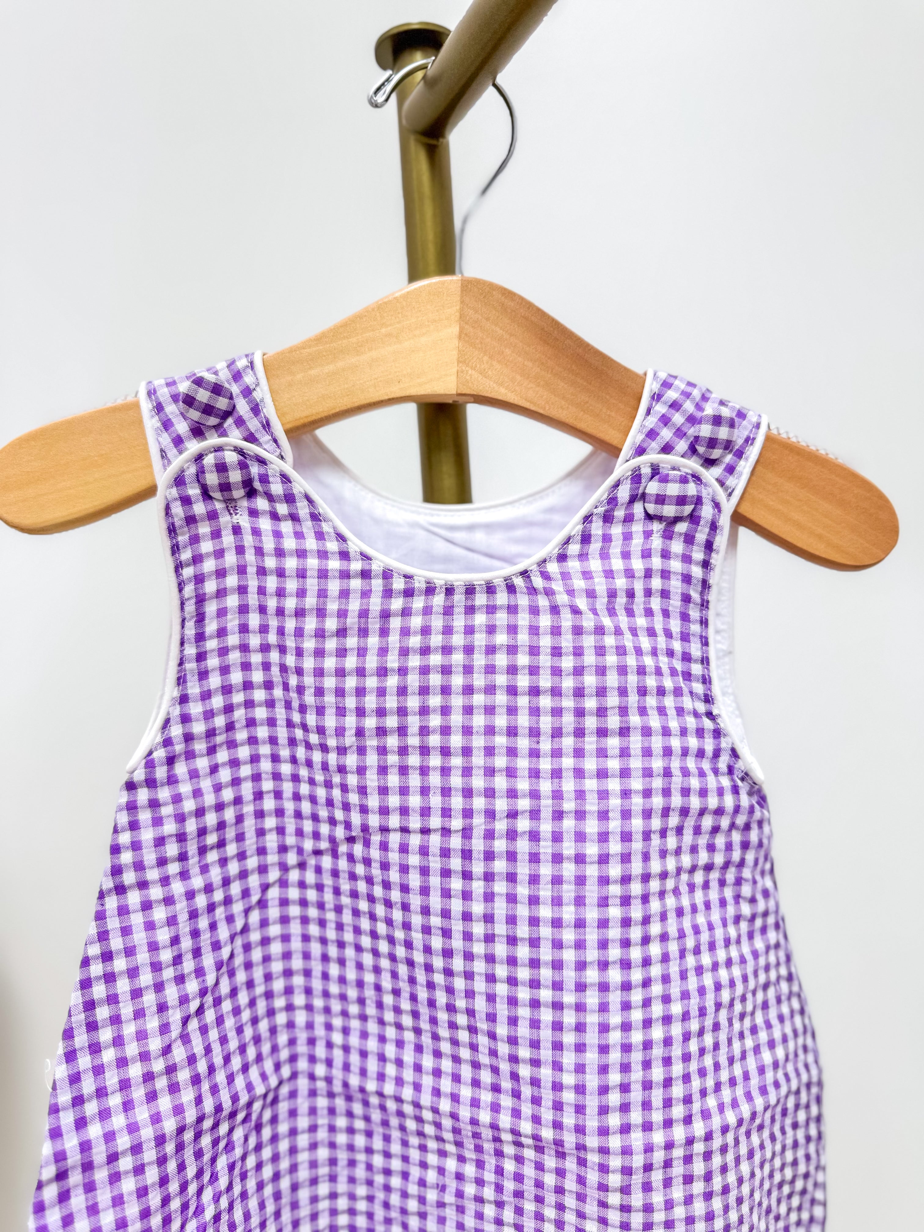 This adorable purple gingham romper is soft, cool and easy to care for. Perfect to wear as is or ready for your embroidery or monogram with its blank front panel. The snaps make it easy for a quick change which is great for you and your cutie.