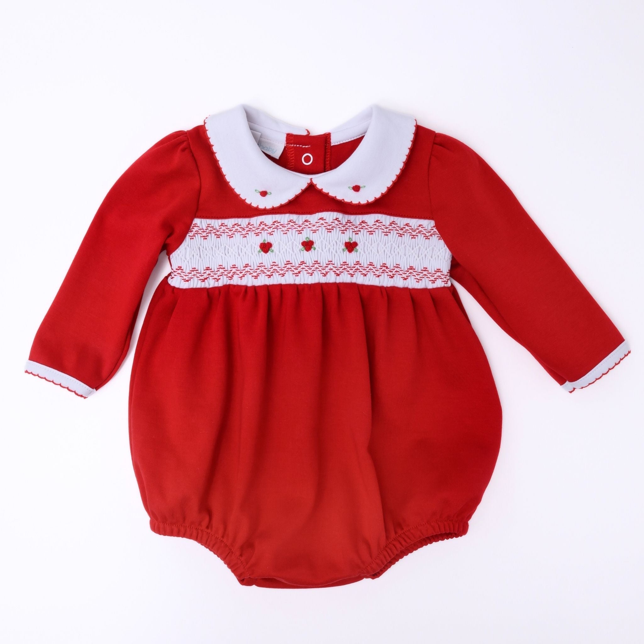 Dress your little one in festive elegance with our Eve Classics Smocked Long Sleeve Bubble - Red. This beautiful white bubble, made from incredibly soft Pima Cotton, boasts intricate hand-embroidered red smocking and delicate accents, perfect for cozy comfort and timeless holiday cheer, even on cooler days.