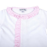 Discover versatile comfort with the Magnolia Baby New Beginnings Ruffle Converter in Pink. This innovative garment, crafted from luxurious Pima Cotton, transforms from a cozy gown into a footed romper with easy snap closures, featuring delicate pink minicheck trim along the placket, neckline, and cuffs. Perfect for newborns, it adapts to your baby's needs throughout the day and night.