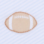 Get ready for a winning day with our sweet Touchdown Cutie Embroidered Bubble! Crafted from luxurious Pima Cotton, this adorable light blue one-piece features a crisp white collar, green piping, and a hand-embroidered football, perfect for game day fun.