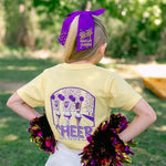 Cheer your heart out! Design features a butter-colored tee with purple and white accents and showcases cheerleaders in a stadium full of fans. This is a back design with a matching specialty left chest logo on the front. 100% Combed Ring-spun Cotton.