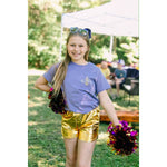 "Alexa, play Shania." Design features a lavender colored tee with purple, gold, and white accents and showcases four golden dancers with a football stadium of fans in the background. This is a back design with a matching specialty left chest logo on the front. 100% Combed Ring-spun Cotton.