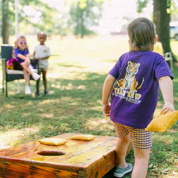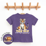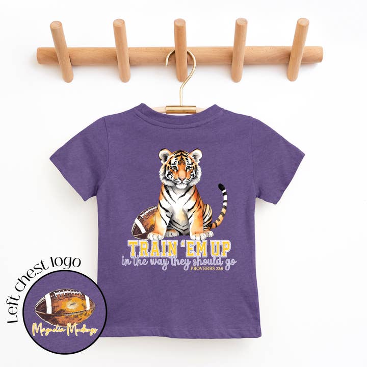 Design features a tiger cub and football with verse 6 from Proverbs 22: "Train 'em up in the way they should go." This is a back design with a matching specialty left chest logo on the front.