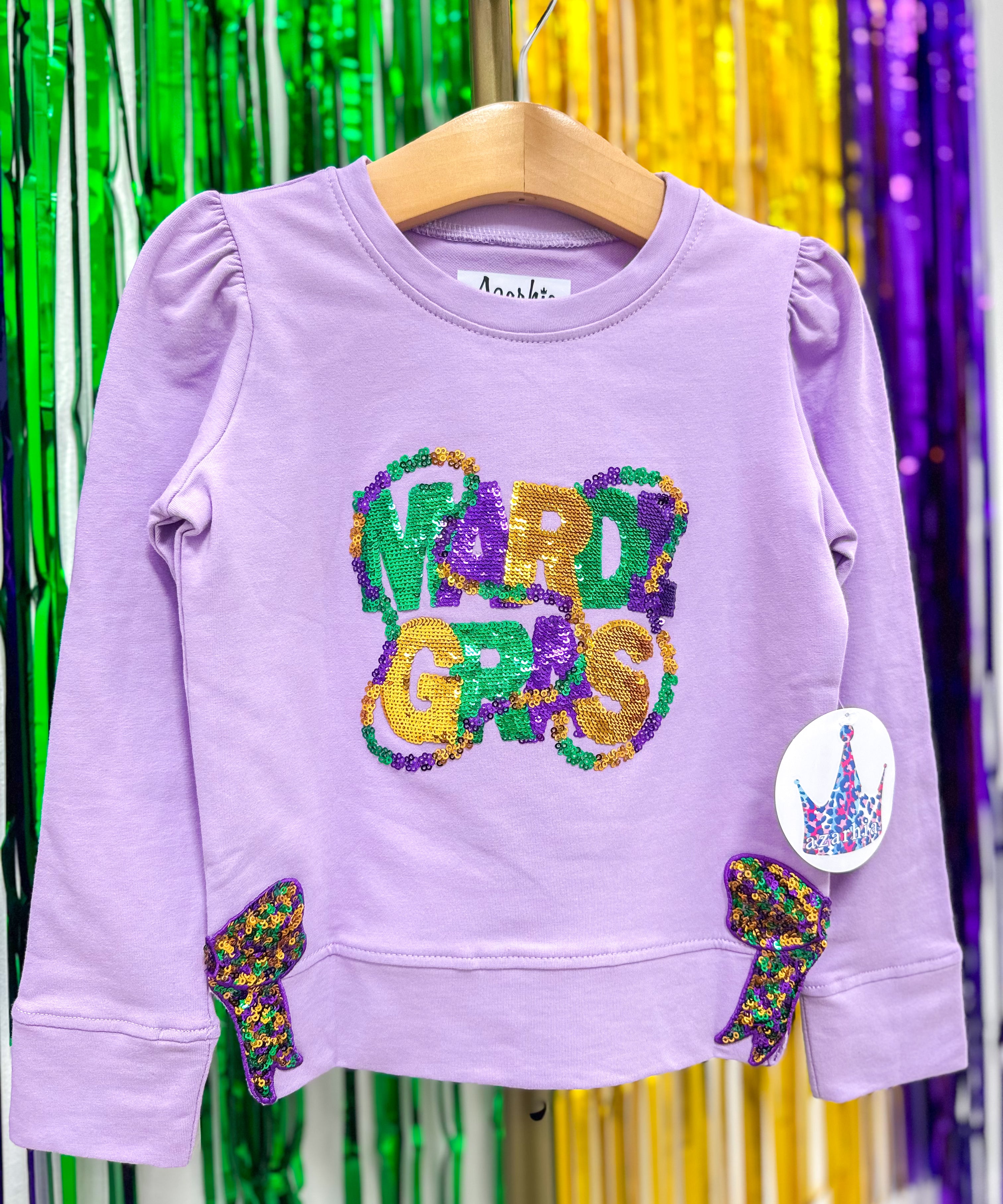 Mardi Gras Beads & Bows Sequin LS Lavender Top