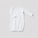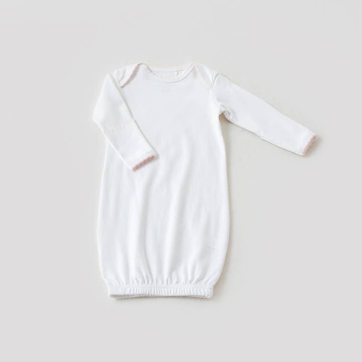 All white with baby pink trim. Your choice of monogram. Newborn gowns are easy to put on, easy access for a diaper change, while still keeping your baby elegant and sweet! They’re a perfect match to all the Take Me Home accessories!