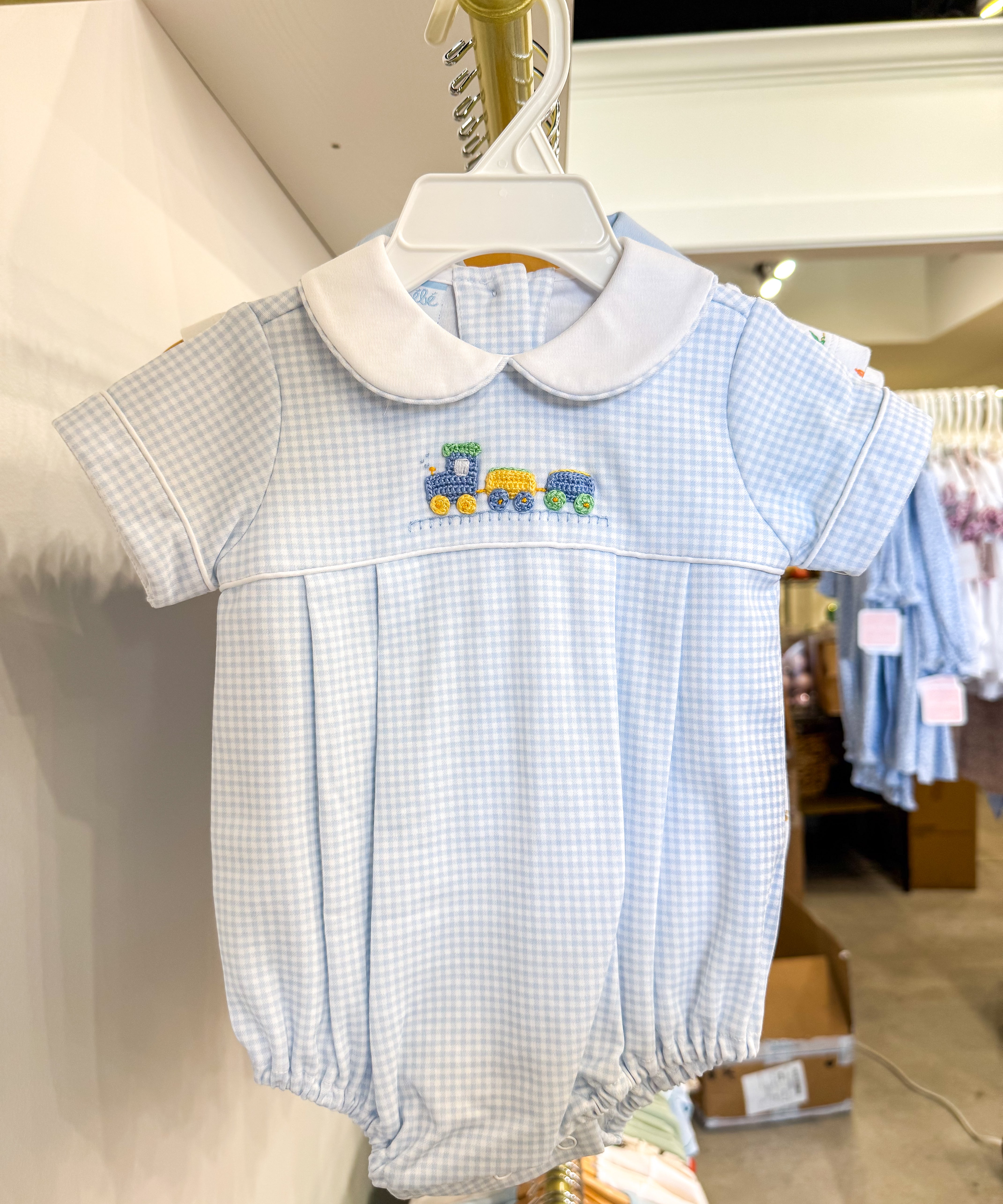 Boys Light Blue Gingham Train Bubble