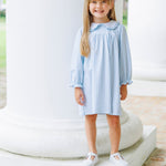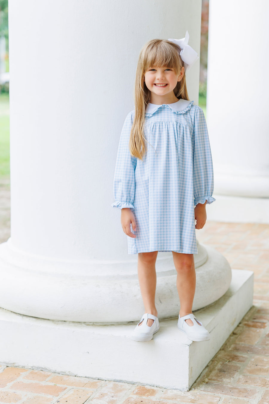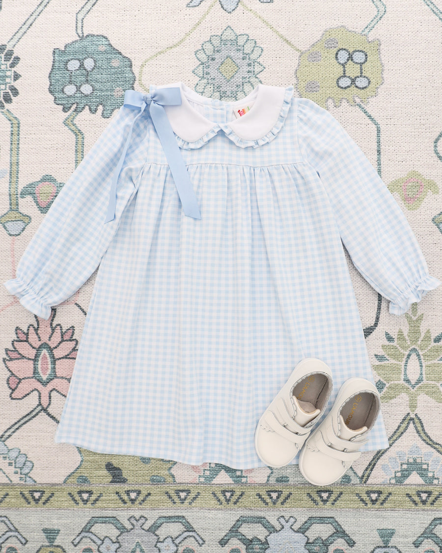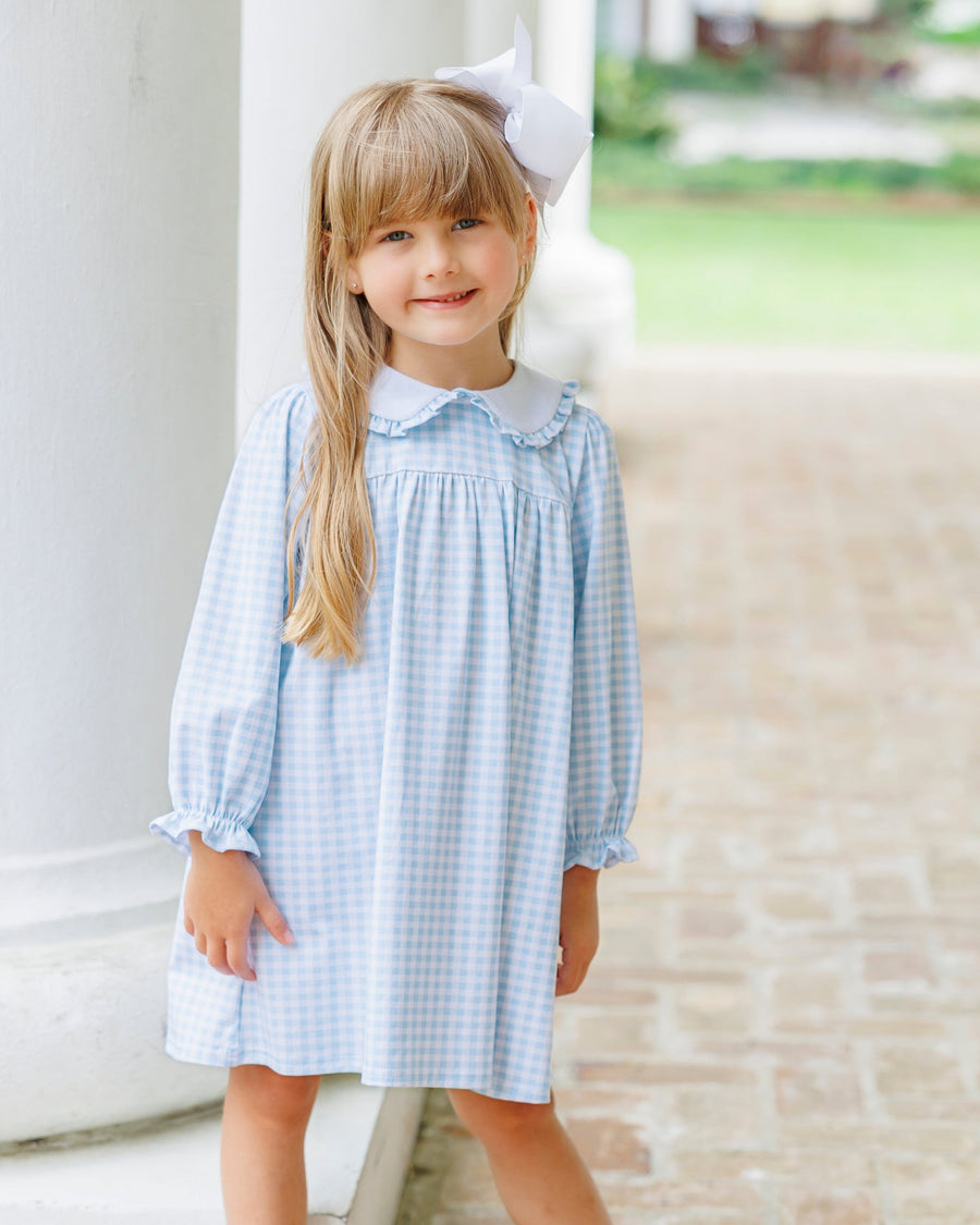 Twirl into autumn with our Catherine Dress in light blue gingham! This charming long sleeve dress features an adorable ruffle peter pan collar that adds just the right touch of whimsy. Perfect for any fall adventure, this playful pattern brings classic charm to cooler days. Watch little ones light up with delight in this sweet seasonal favorite!