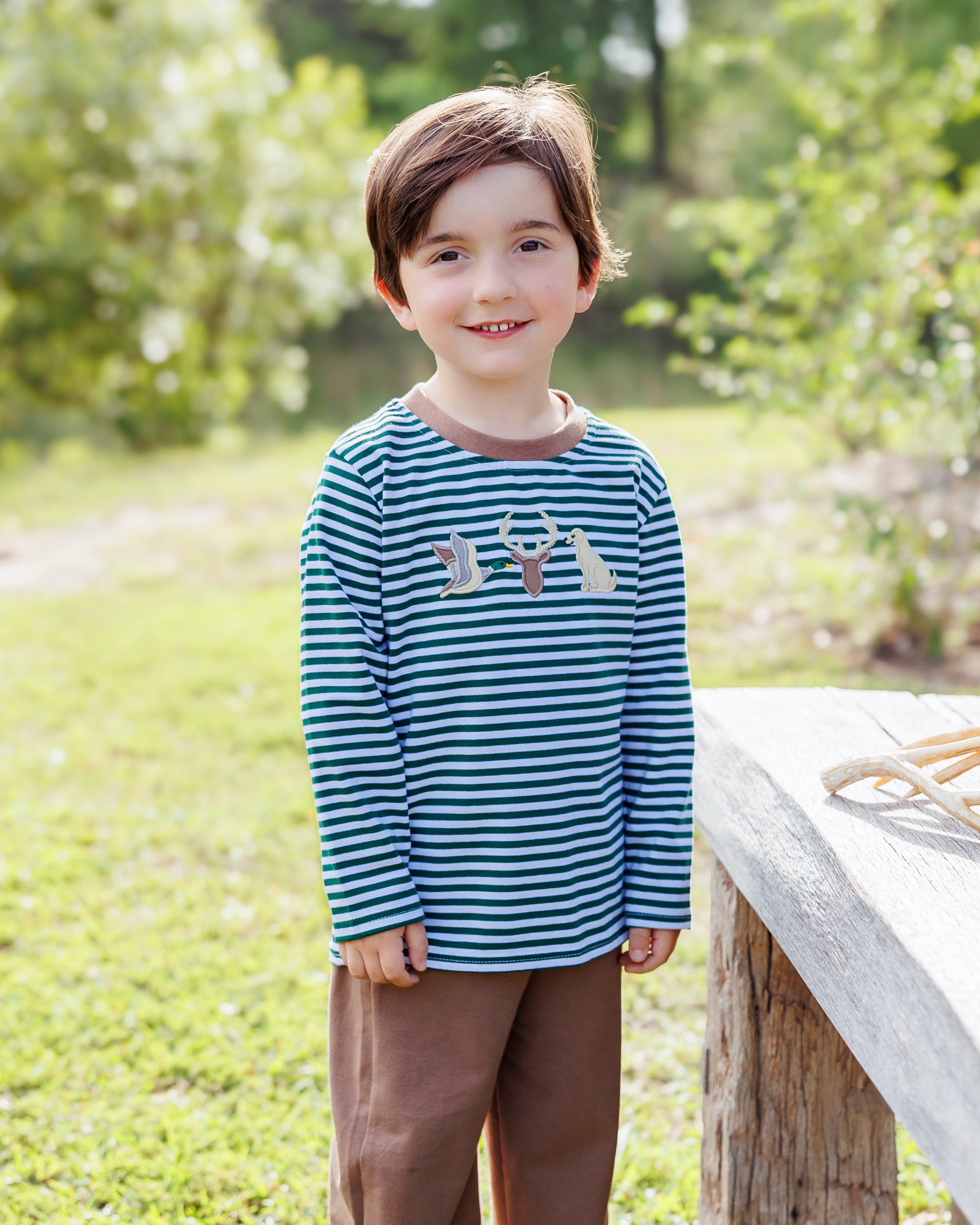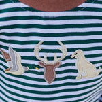 Get ready for fall adventures with our Hunting Buddies Pant Set! This playful ensemble features a long-sleeve top adorned with a duck, a deer, and a dog appliques that bring the wilderness to your little one's wardrobe. Paired with coordinating brown pants, this outfit is perfect for your tiny explorer's autumn escapades. Comfy, cute, and ready for outdoor fun!